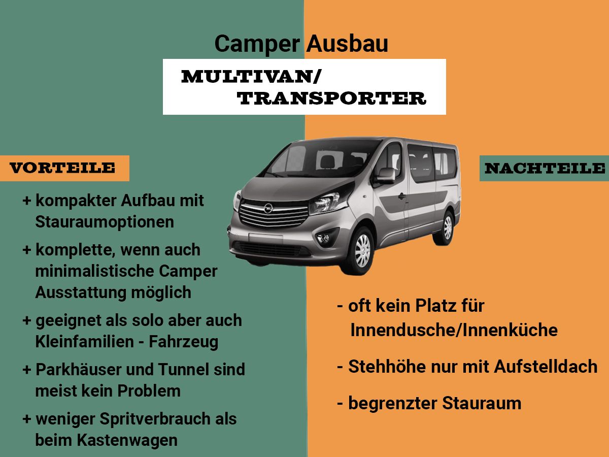 Der große Vorteil dieser mittelgroßen Basisfahrzeuge ist, dass sie einerseits als normaler Alltags-PKW und andererseits als Campingbus dienen. Auch in einer Stadt sind diese Fahrzeuge enorm praktisch, da sie auf normalgroße PKW-Parkplätze passen, aber auch in die meisten Tiefgaragen und Parkhäuser. Minuspunkte macht der Van im Bereich Stauraum und Sanitär.